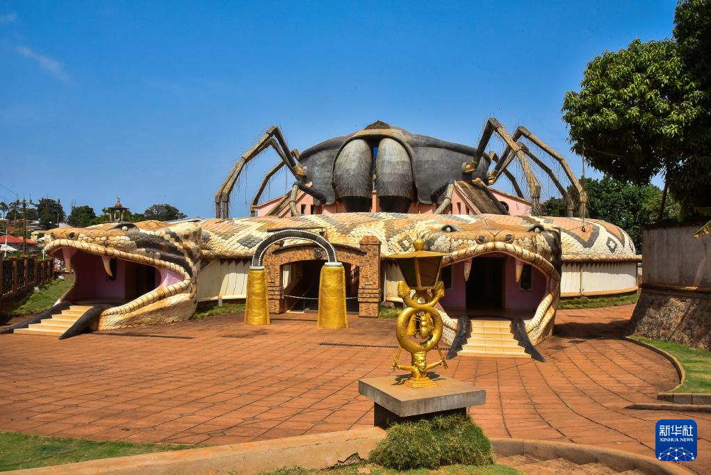 这是4月12日在喀麦隆西部大区丰班拍摄的根据巴蒙象征“双头蛇、蜘蛛和双锣”修建的新博物馆——巴蒙国王博物馆。