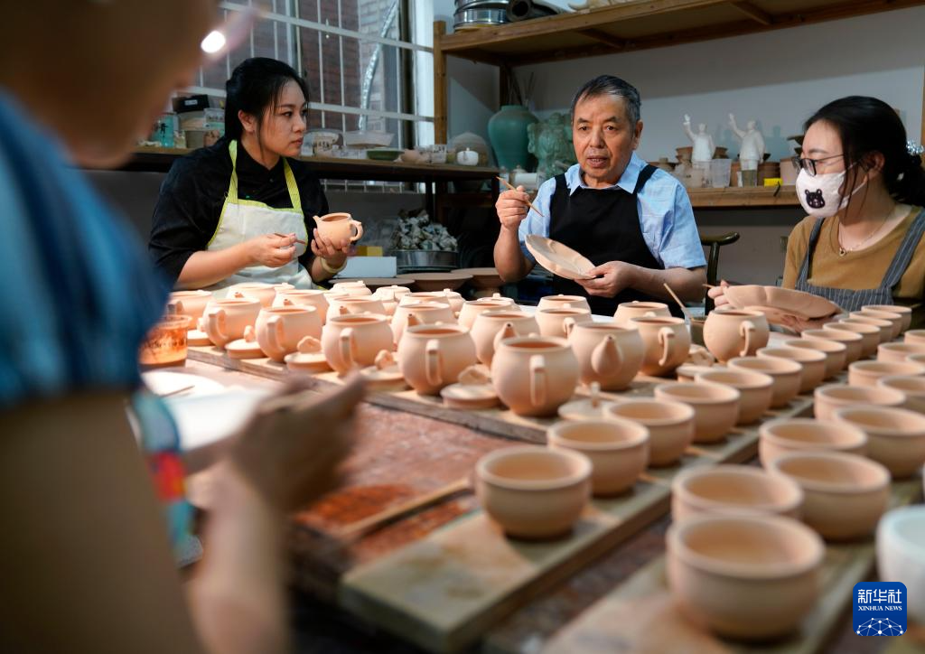 6月8日,刘法星(右)为两名徒弟讲解制瓷工艺相关知识。