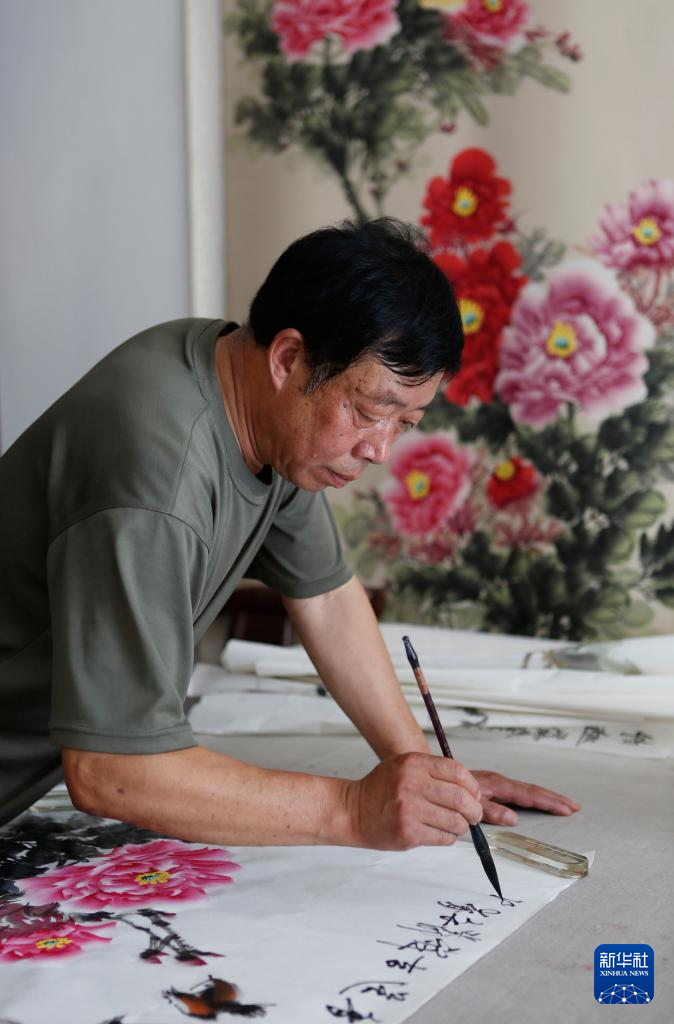 7月26日,平乐牡丹画产业带头人之一的画师郭泰森在自己的工作室绘制牡丹画。