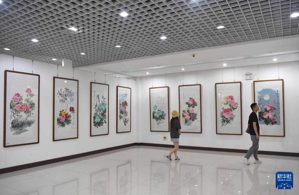7月26日,来访者在平乐社区的牡丹画创意产业园区展厅内观赏牡丹画。
