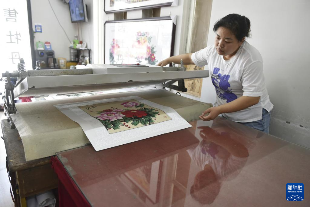 7月26日,工作人员在平乐社区的牡丹画创意产业园区工作室内装裱牡丹画。