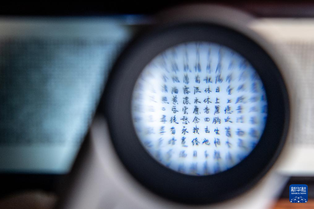 7月31日,潘启慧在通过显微镜观察微刻作品《清明上河图》。这件作品是在长5.29厘米、宽0.24厘米的动物骨头上仿刻《清明上河图》。