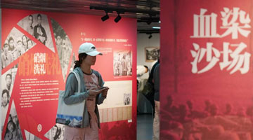 9月14日,观众参观陕西西安少陵原十六国大墓出土的骑马吹角俑和骑马击鼓俑。