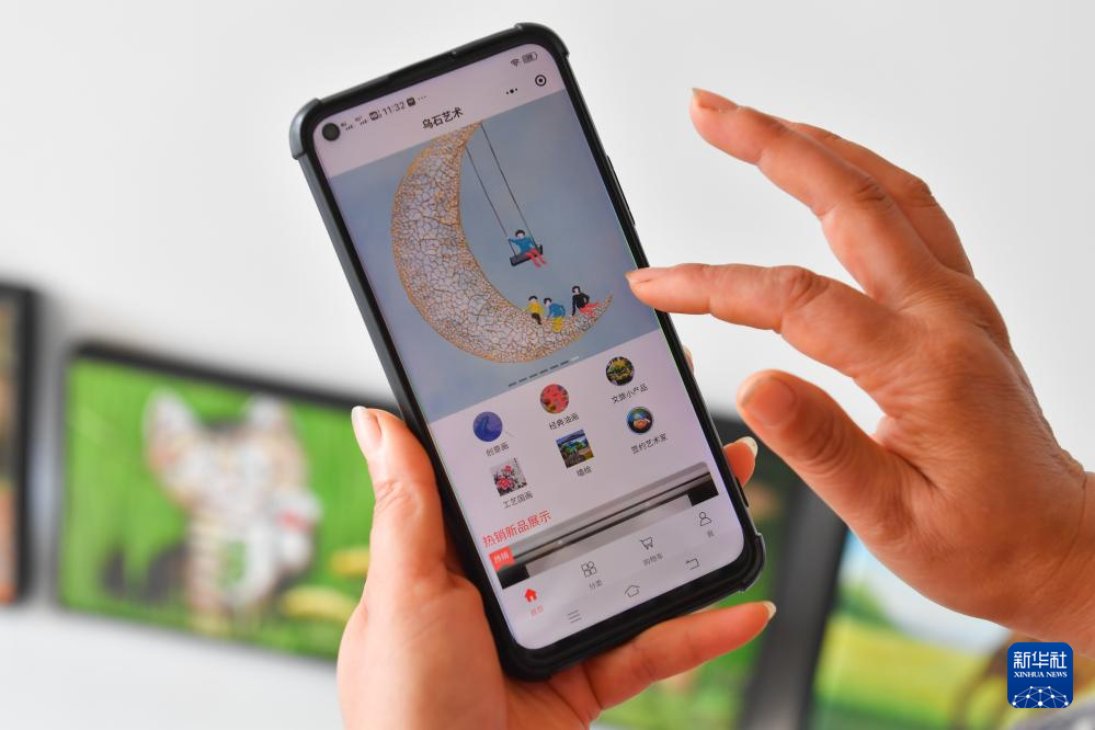 11月8日,在湖南省浏阳市小河乡乌石村的乌石当代艺术馆,农民演示如何通过“乌石艺术”小程序购买油画.