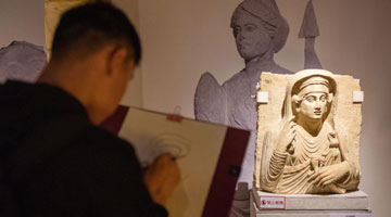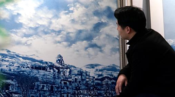 12月27日,一位画师在展览现场展示传统热贡唐卡的绘制工艺。