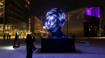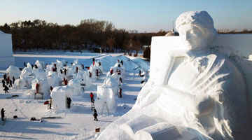 1月13日,在韩国江原道的华川山鳟鱼节现场,游客在哈尔滨工匠制作的韩国光化门冰雕作品前留影。