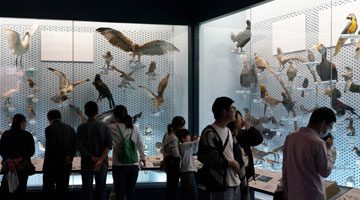 3月23日,马赛在天津市武清区博物馆向参观马氏花丝镶嵌制作技艺专题展的观众介绍展品。