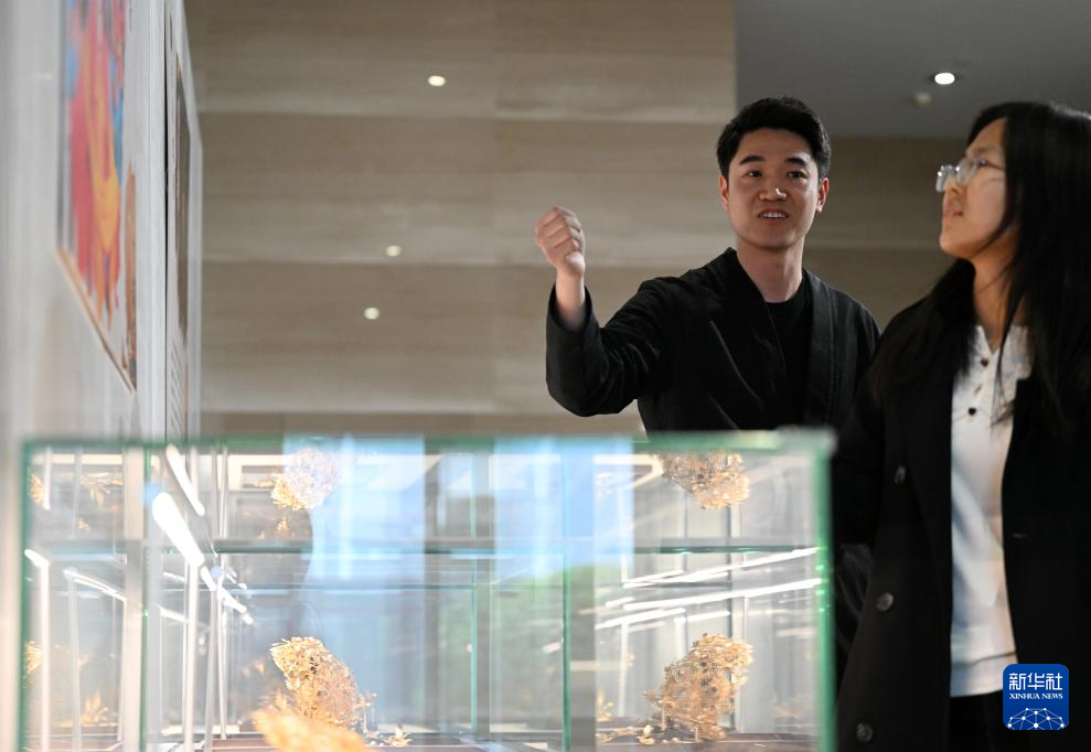 这是天津市武清区博物馆马氏花丝镶嵌制作技艺专题展上展出的马赛的作品(3月23日摄)。