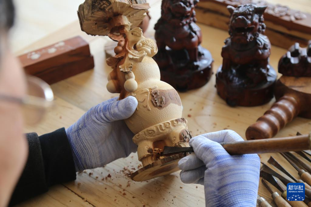 3月26日,在山东省滨州市沾化区大高镇枣木雕刻工坊内,木雕艺人崔树曾在制作木雕。