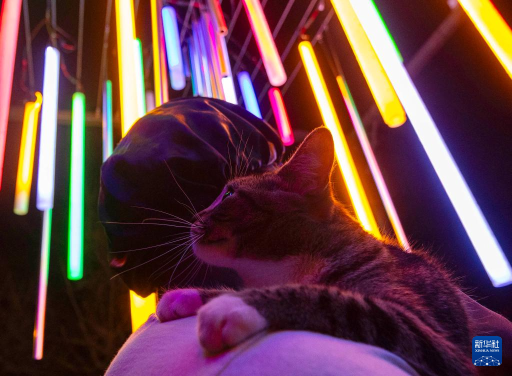 4月15日,一只猫咪和主人在加拿大多伦多艺术灯光秀上看彩灯。新华社发(邹峥摄)