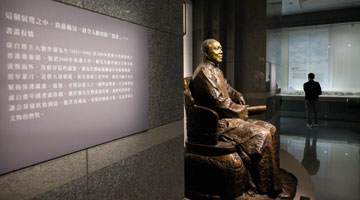 7月4日 ,一位参观者在给孩子讲解展览上的内容。