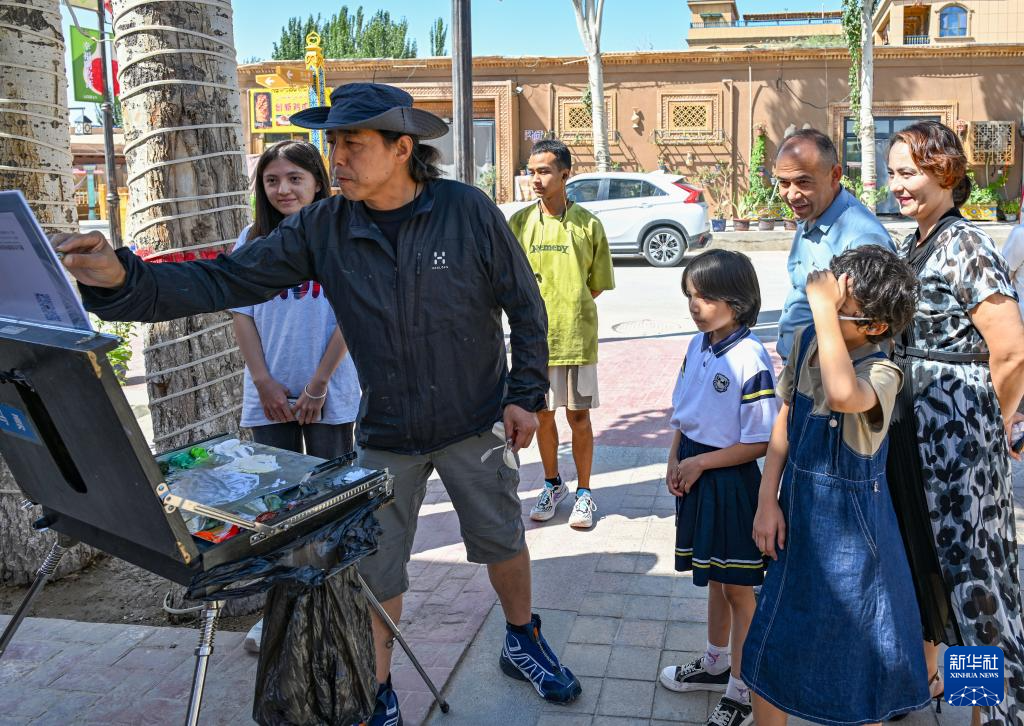 7月6日,在新疆克州阿图什市松他克镇阿孜汗村,村民在围观小分队文化志愿者写生创作。