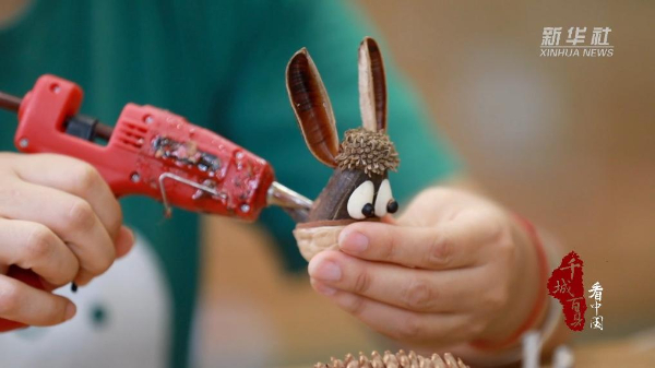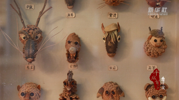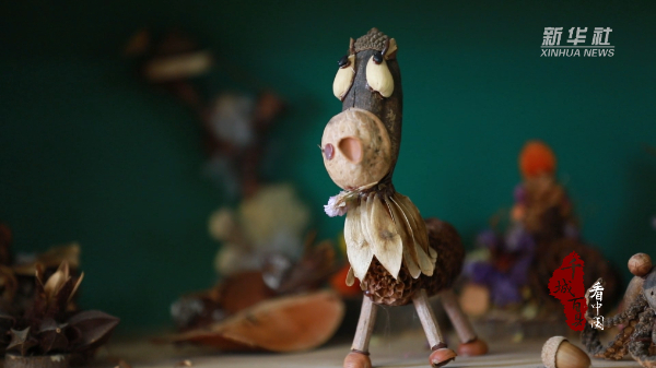 在河北省保定市莲池区,手工艺人尚芳发挥创意,采用独特技法,将松果、坚果壳等不同自然材料粘贴组装,制作成龙、猫头鹰、大象等动物造型的手工艺品,尽物之美、得物之趣,深受当地群众喜爱。