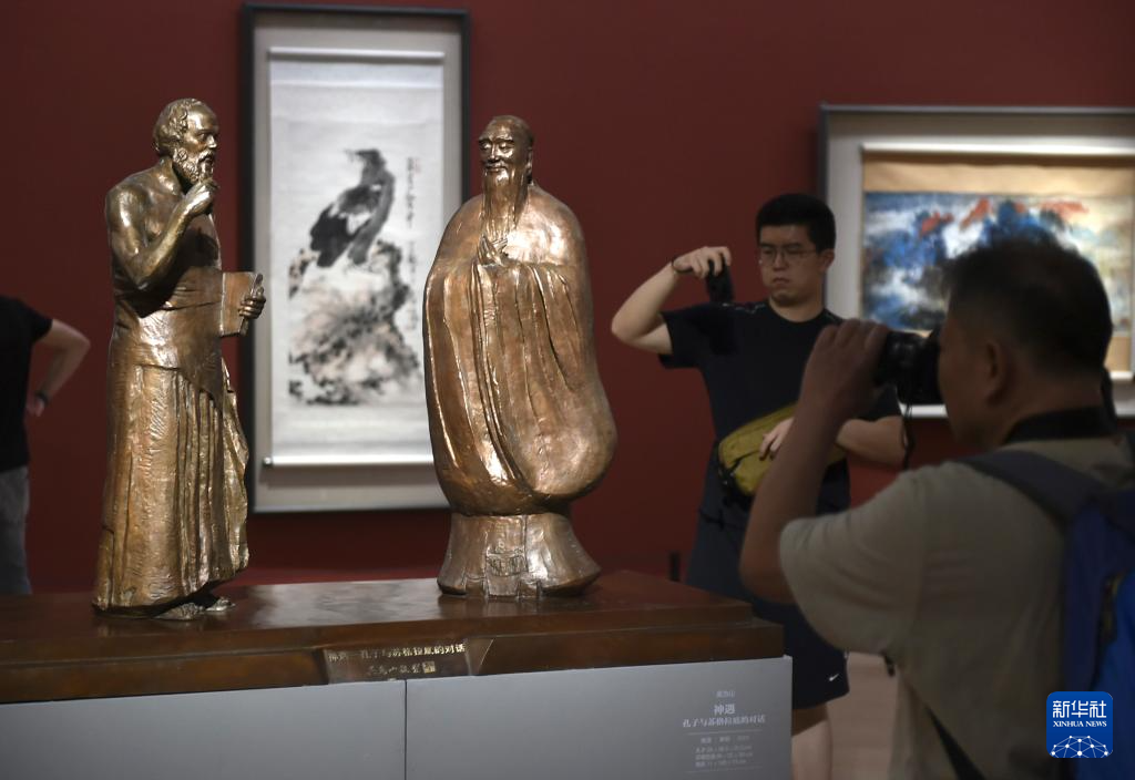 8月31日,观众在中国美术馆参观拍摄展出雕塑作品“神遇-孔子与苏格拉底的对话”。
