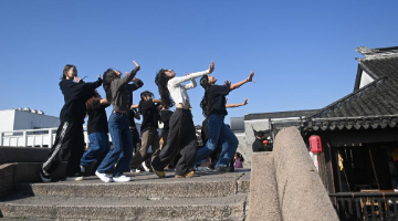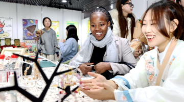 12月9日,西洛(左一)和同事交流西藏传统面具制作心得。