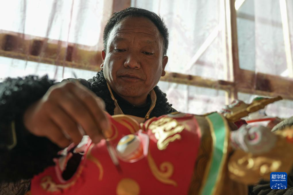 12月9日,合作社的工匠在合作社门前的空地上检查做好的西藏传统面具。