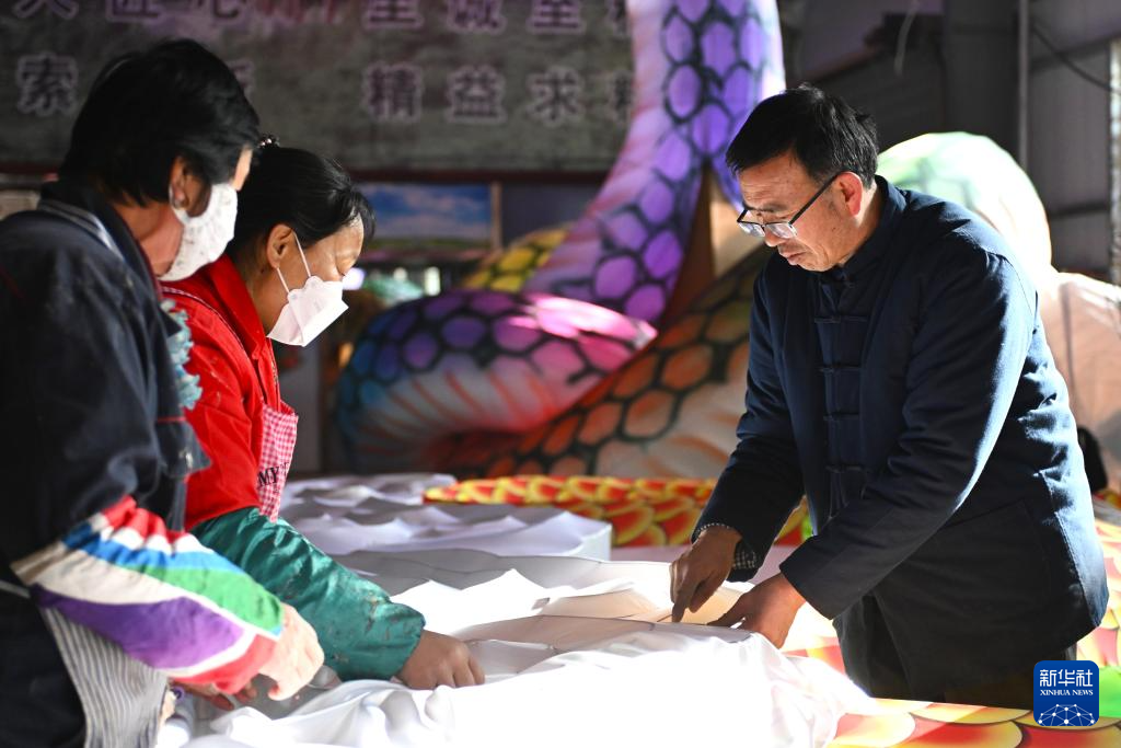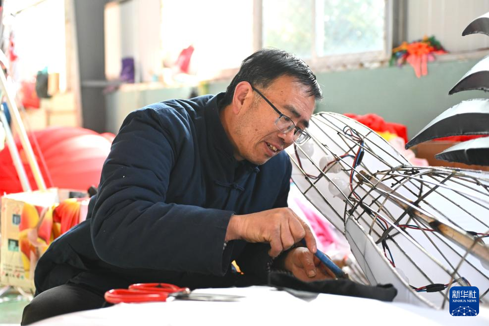 1月8日,苏红章在宁夏固原市隆德花灯传承基地生产车间为花灯裱糊。