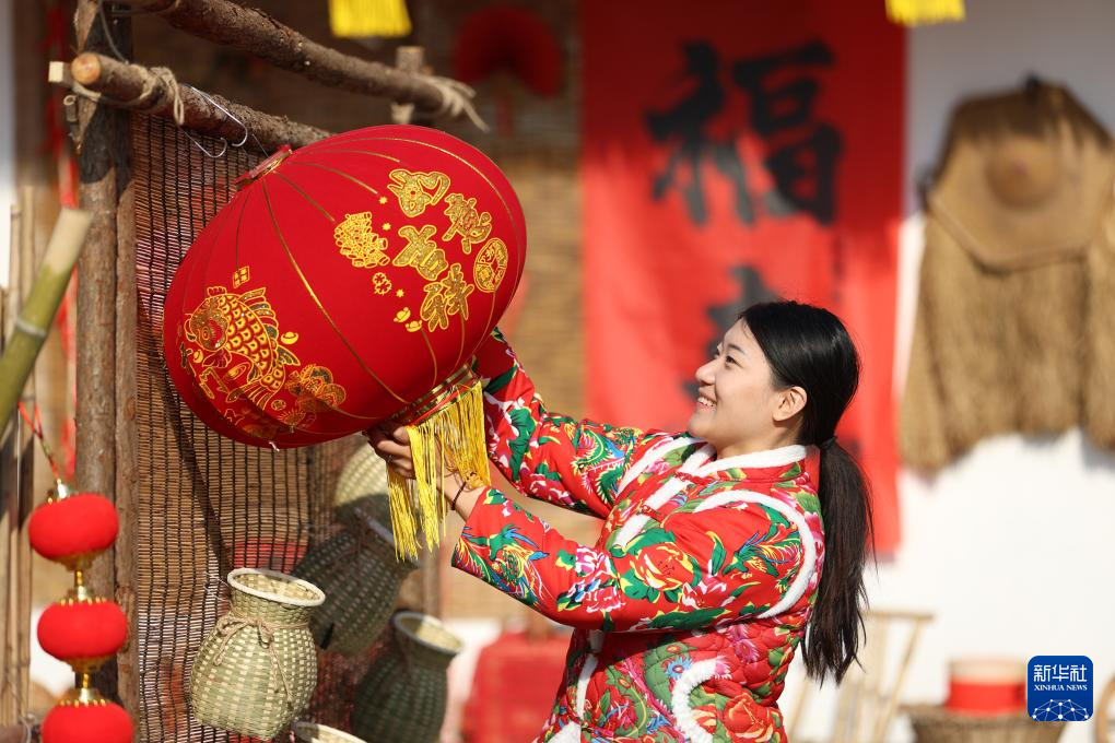 1月18日,山东省临沂市郯城县郯城街道椿枫十里融合农场工作人员在悬挂大红灯笼。