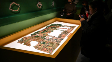 1月21日,参观者在“万古长歌——湖南史前文明图卷展”上观看图卷。