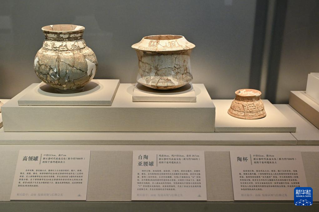 1月21日,参观者在“万古长歌——湖南史前文明图卷展”上观看陶器。