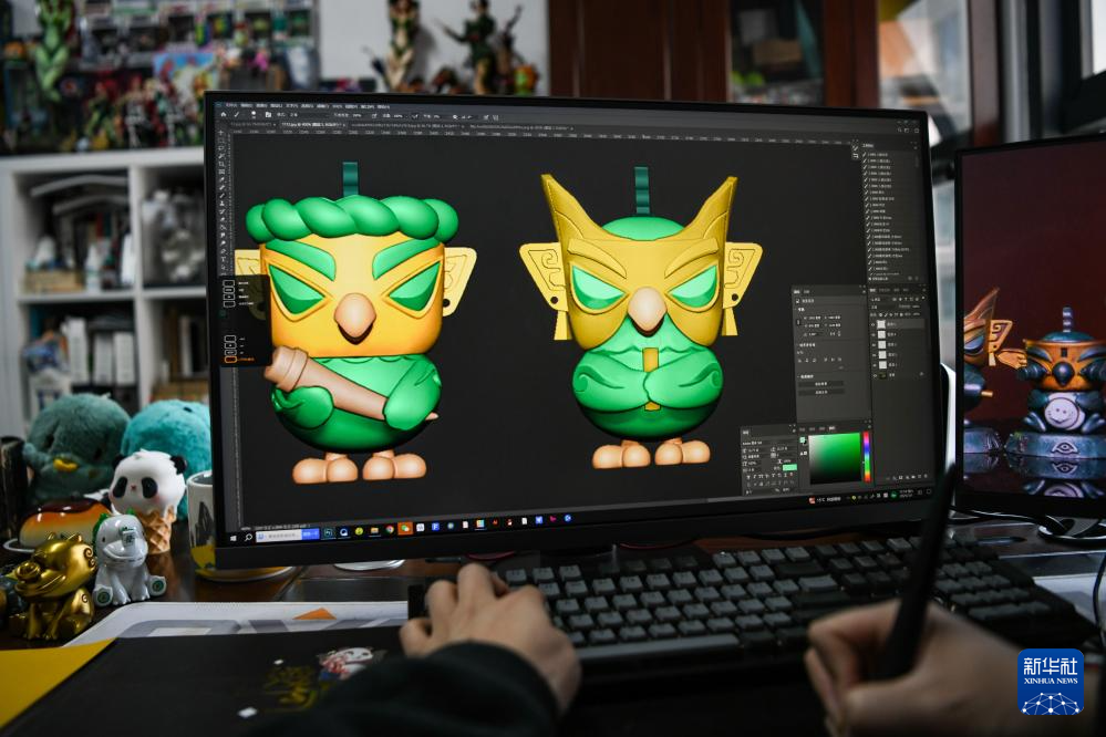 2018年,曾舟辞掉游戏设计的工作,成为独立设计师。一次去三星堆博物馆参观时,馆内的青铜文物造型让曾舟萌生了创作的灵感。他以青铜神树、青铜纵目面具、青铜兽面等文物作为创作蓝本,结合当下的潮玩元素,将模型的身体比例做适当调整,让潮玩作品拥有“千里眼”“顺风耳”和“天然呆”的卡通感,设计的文创作品时尚新潮、俏皮可爱。