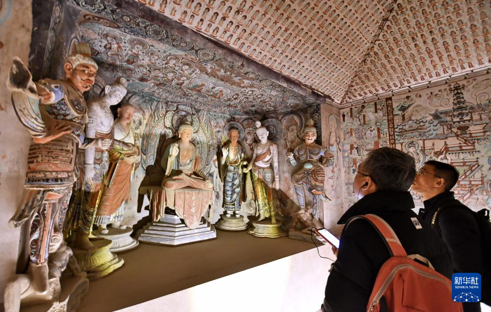 3月29日,观众在参观“如是莫高”敦煌艺术大展中展出的莫高窟第45窟的复刻版本。