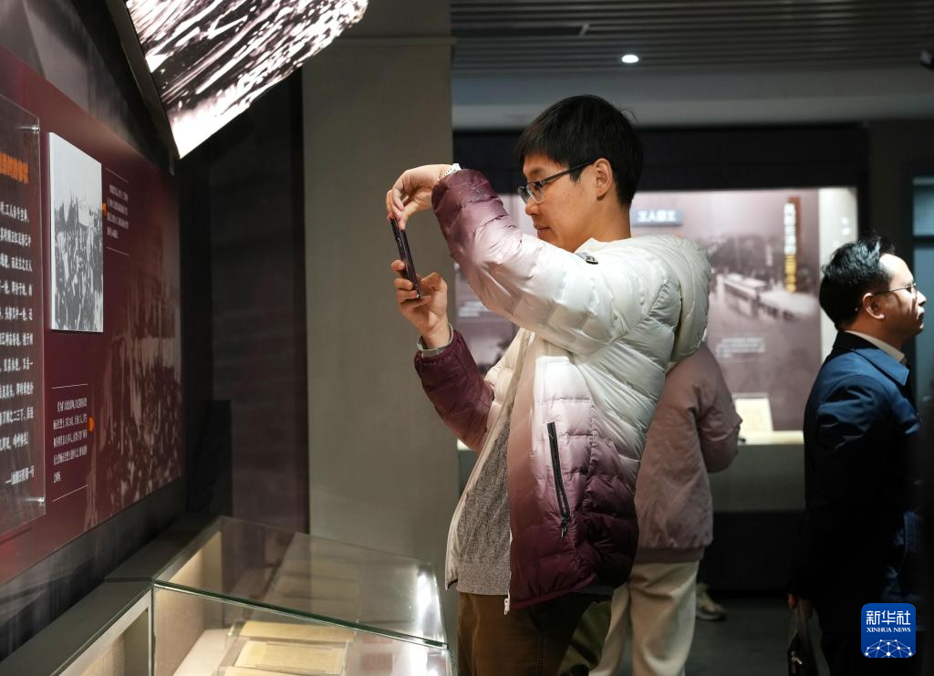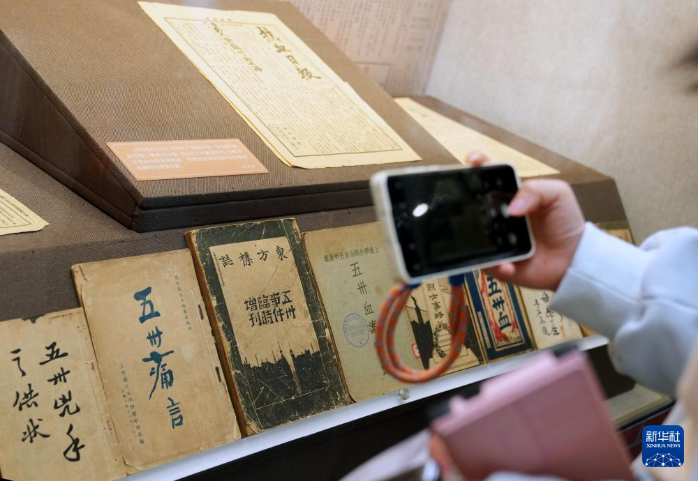 3月31日,观众在展览上拍摄展出的揭露五卅惨案真相的书籍刊物。