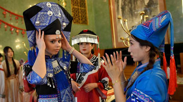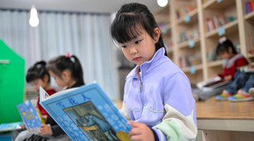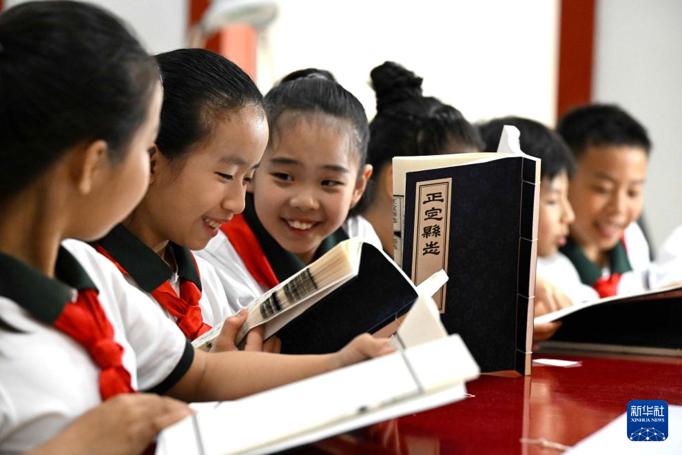 4月21日,石家庄市实验小学学生在石家庄市图书馆古籍修复室翻阅现代线装书并交流学习体会。