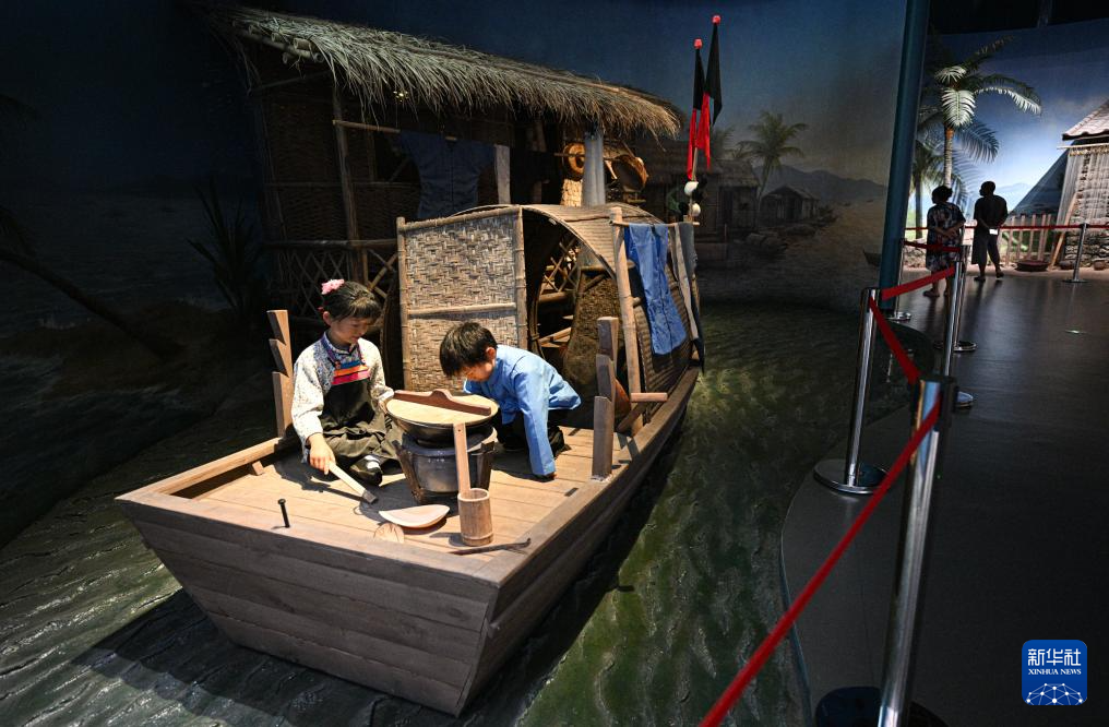 5月13日在海南疍家博物馆拍摄的展示疍家人生活在住家船上的场景。早期疍家人大多居住在船上,每户一般有一至两艘船用于作业和居住。