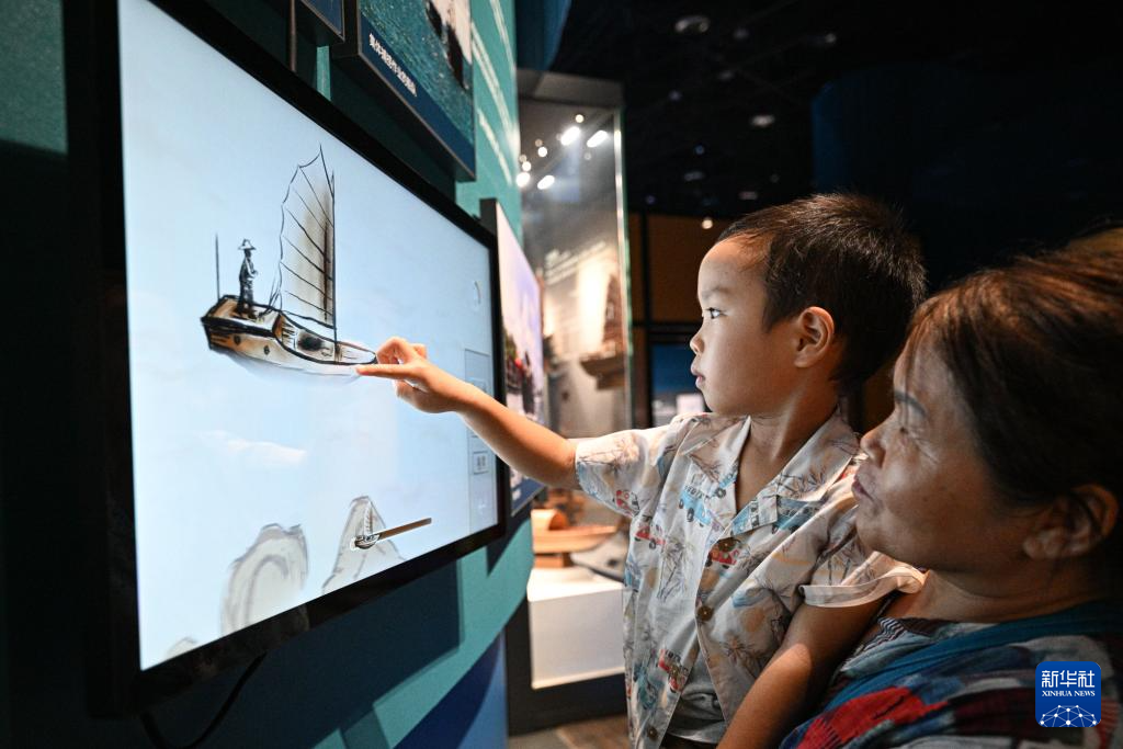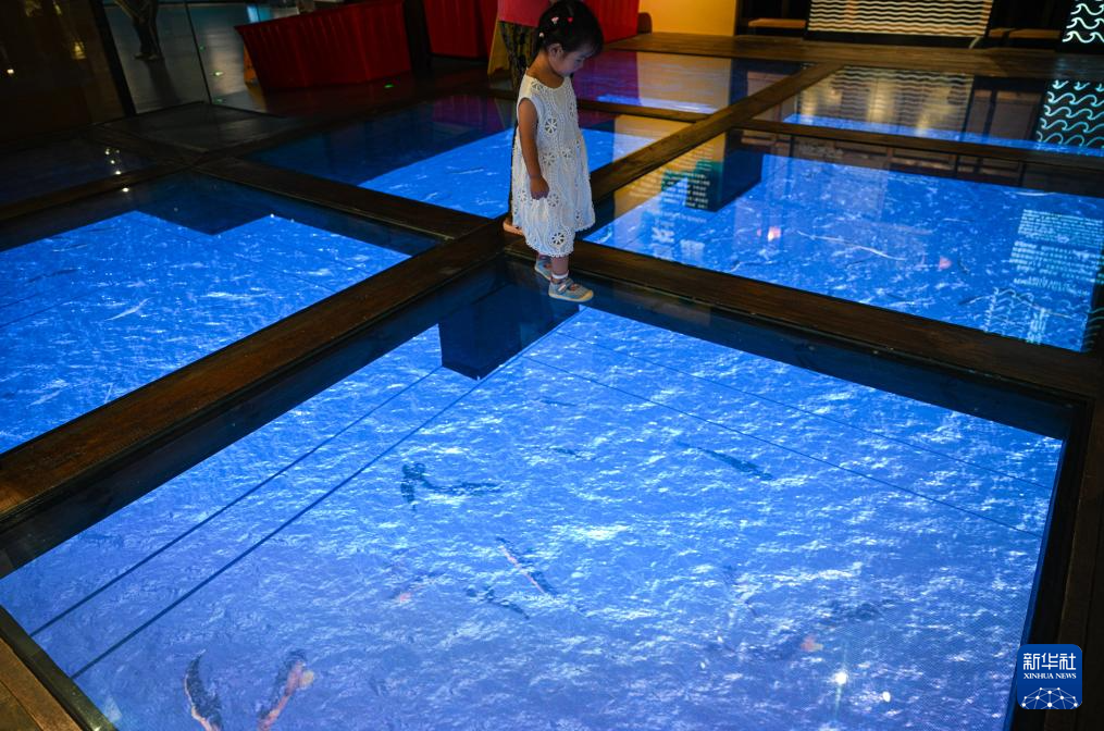 5月13日,游客在海南疍家博物馆观看展现疍家渔排底部水产养殖的动画。