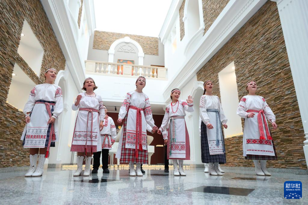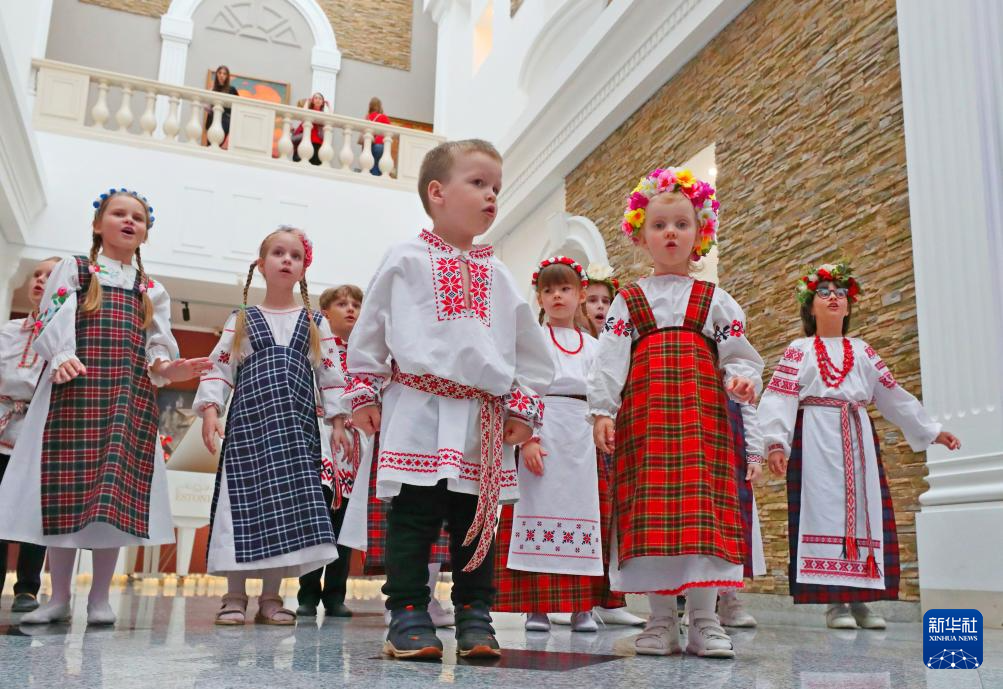 5月17日,在白俄罗斯首都明斯克的白俄罗斯国家美术馆,身着当地民族服饰的孩子们演唱传统歌曲。