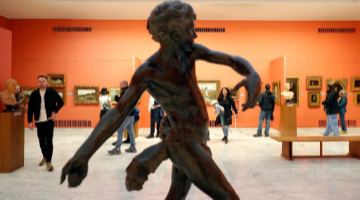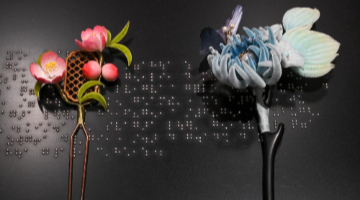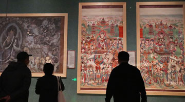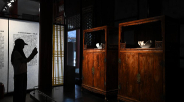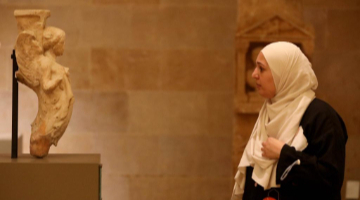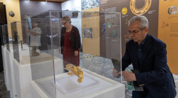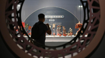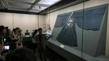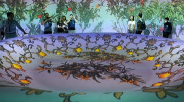 5月20日,人们在大汶口遗址博物馆通过多媒体设备多角度观看大汶口遗址出土的八角星纹彩陶豆。