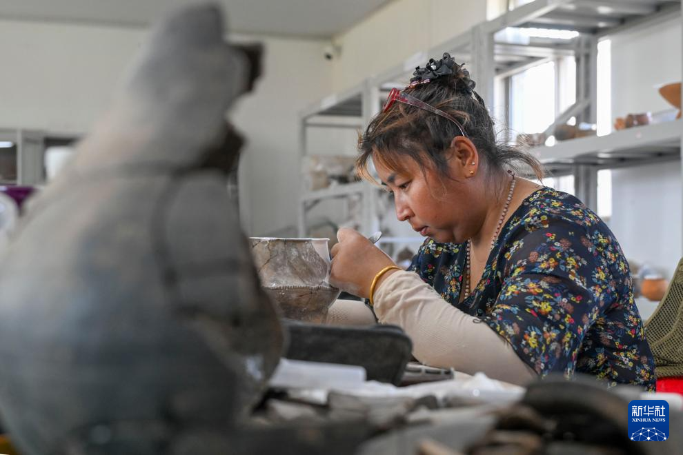 5月20日,考古工作者在大汶口遗址考古工作站对出土器物进行修复。
