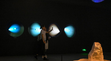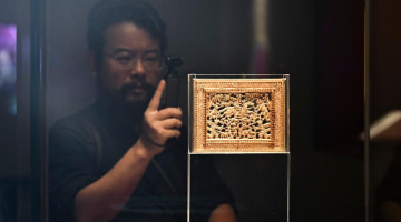 7月16日,参观者在汉魏洛阳故城遗址博物馆观看展品陶百花灯。
