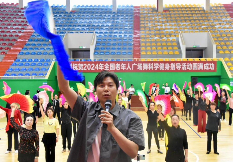 2024年4月9日,2024年全国老年人广场舞科学健身指导活动在陕西省咸阳市举行。图为教练员在给学员培训广场舞套路。新华社记者 郑昕 摄