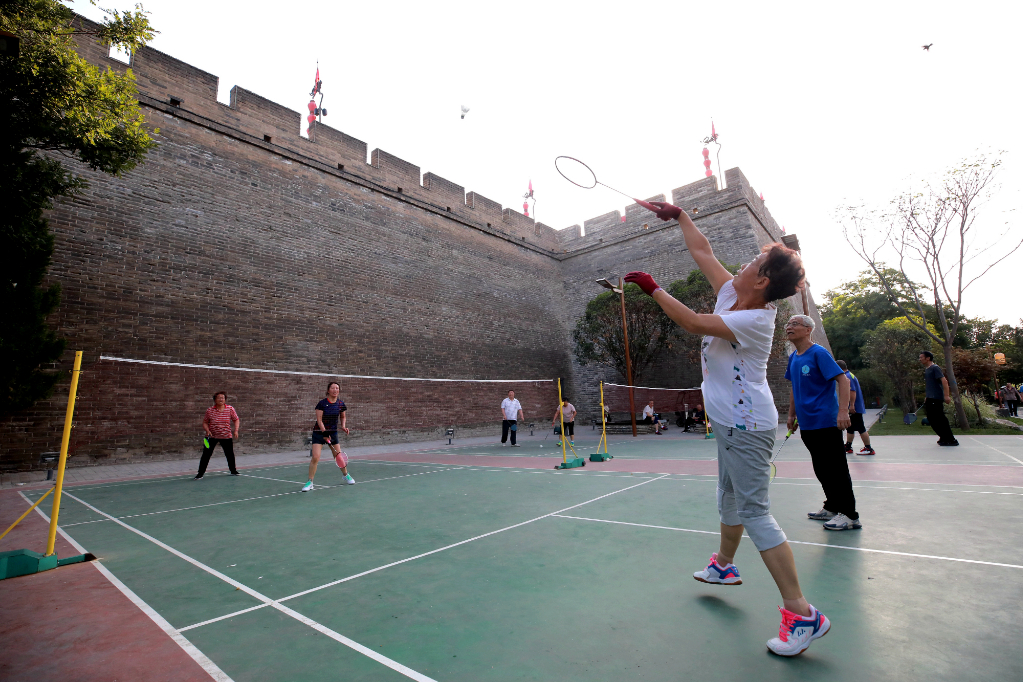 图为2024年6月12日,市民在西安城墙下的环城公园文昌门至和平门段打羽毛球。新华社发(牛纲摄)
