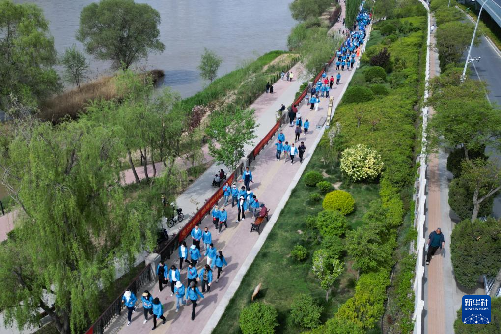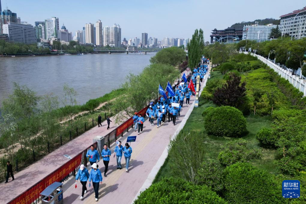 4月25日,兰州市基层工会的职工代表在黄河畔参加健步走活动(无人机照片)。