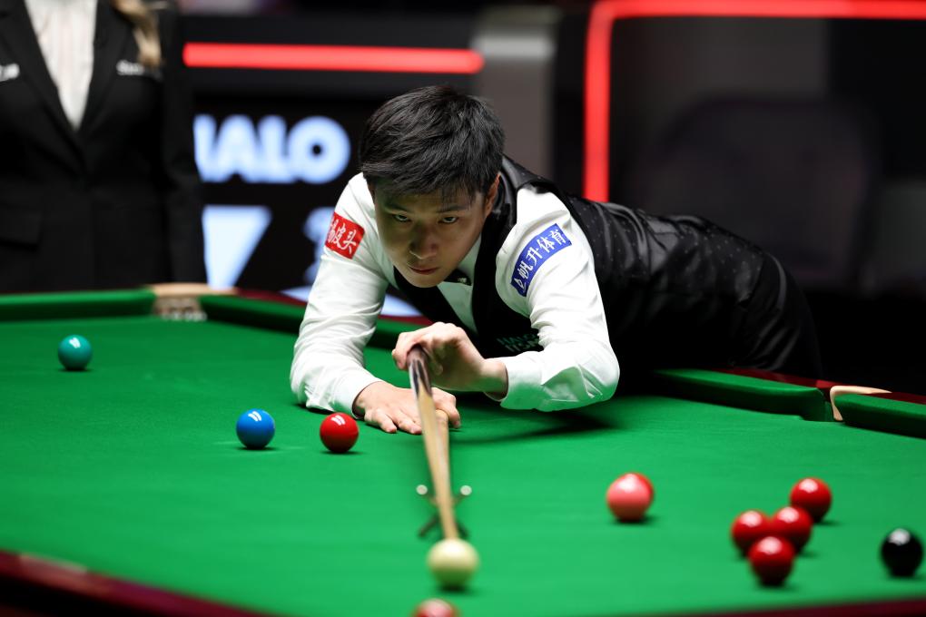 5月5日,赵心童在2025年斯诺克世锦赛决赛中。新华社发(翟政 摄)