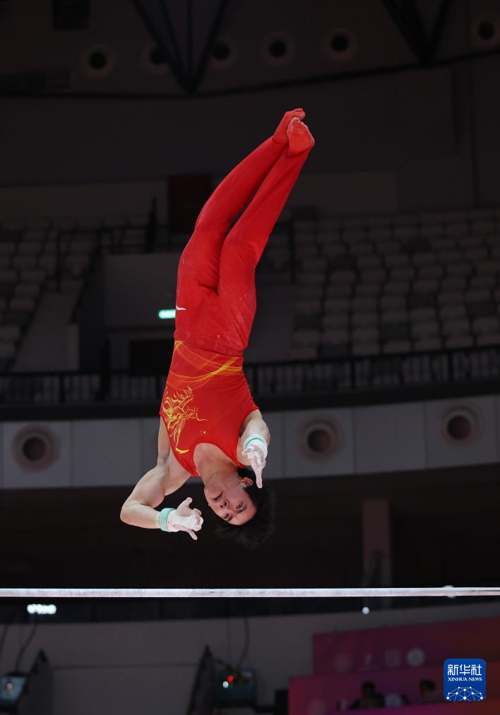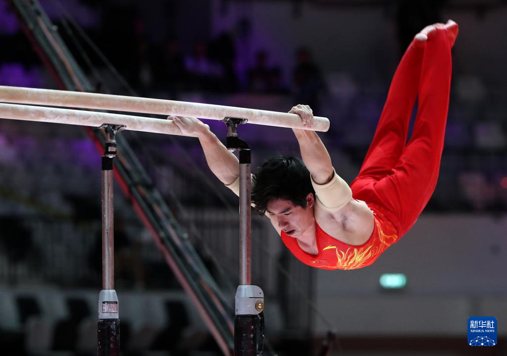 10月22日,张博恒在男子个人全能决赛双杠项目比赛中。