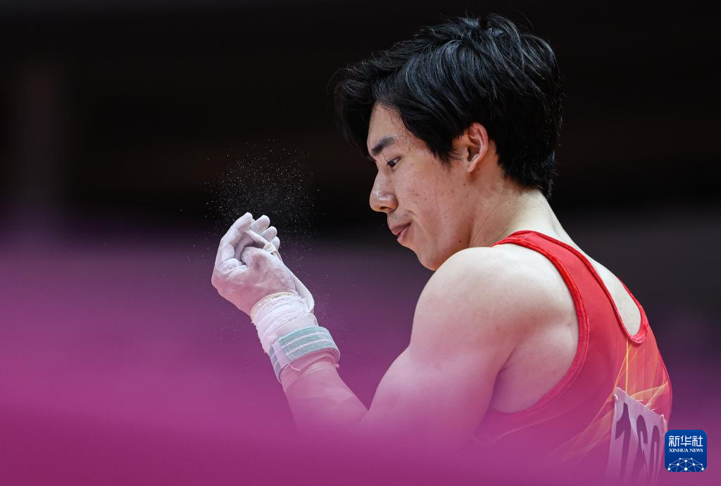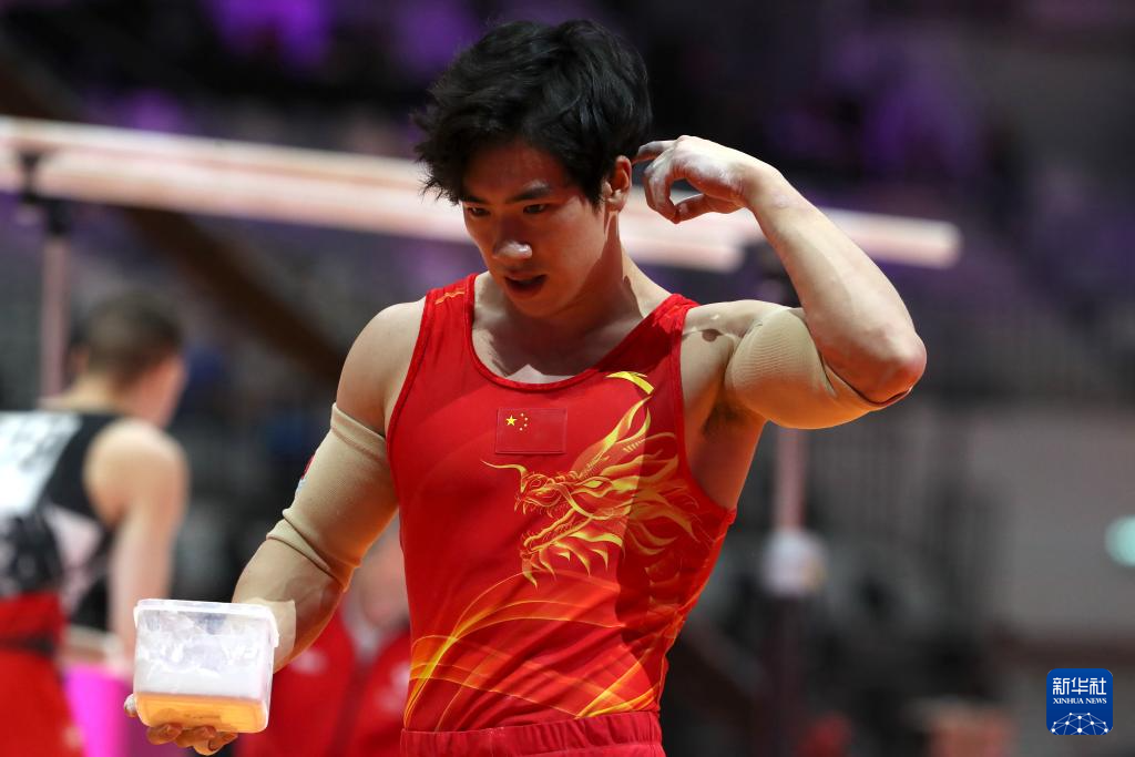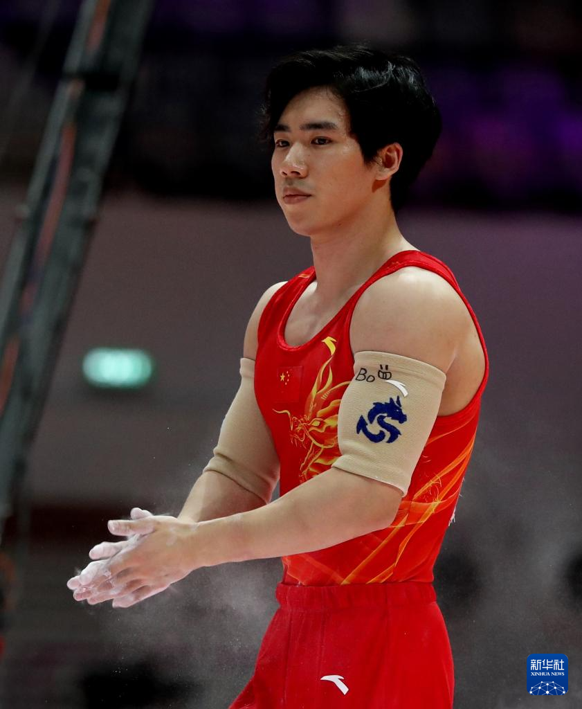 10月22日,张博恒在男子个人全能决赛双杠项目比赛前。