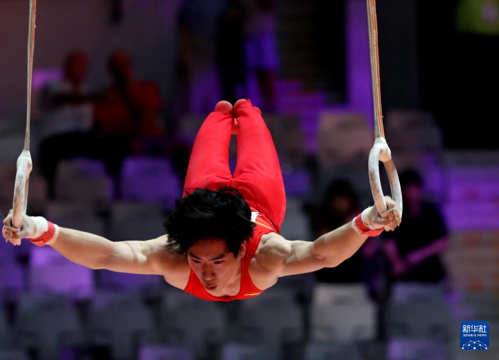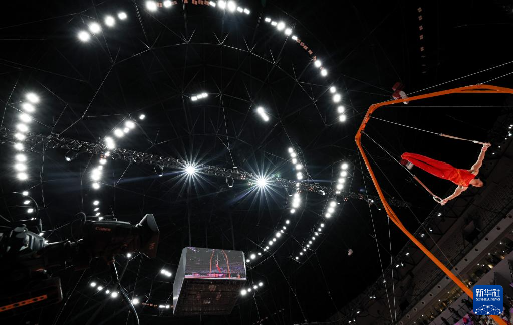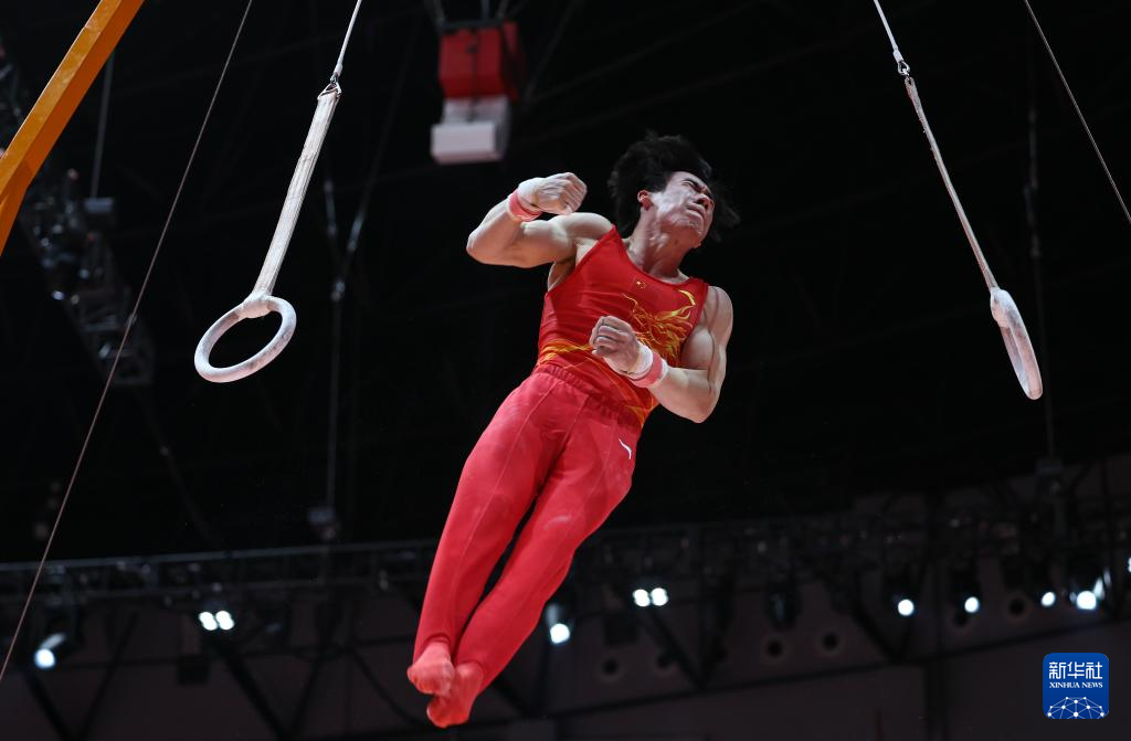 10月22日,张博恒在男子个人全能决赛吊环项目比赛中。