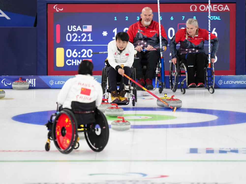 轮椅冰壶赛场,中国队混双组合王蒙/杨金桥对阵美国的德怀尔/埃姆特。中国队开局慢热,前三局以0:4落后,但第四局抓住后手机会一举拿下4分。接下来两局中国队将比分反超为6:4,但美国队最后两局收获3分,最终7:6胜出。