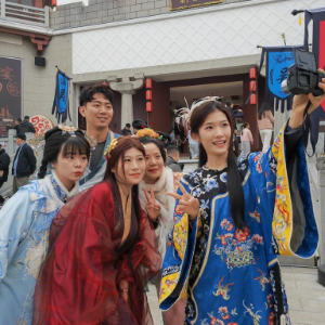 知音殿前,武汉大学临床医学系学生田曲文格外引人注目。来自台湾新北的她穿着一身天蓝色的明制汉服,走动间,衣襟处垂挂的珍珠流苏轻轻摇曳,灵动飘逸。