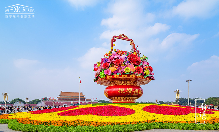 我們在天安門廣場中心布置了“祝福祖國”的巨型花果籃。籃內的一千朵花、一百只果匯聚成一句話就是:祝福祖國繁榮昌盛,祝福人民幸福安康。底花壇的十個紅心圖案象征著全國人民心心相印,團結一致,為實現中華民族偉大復興的“中國夢”而努力奮斗。