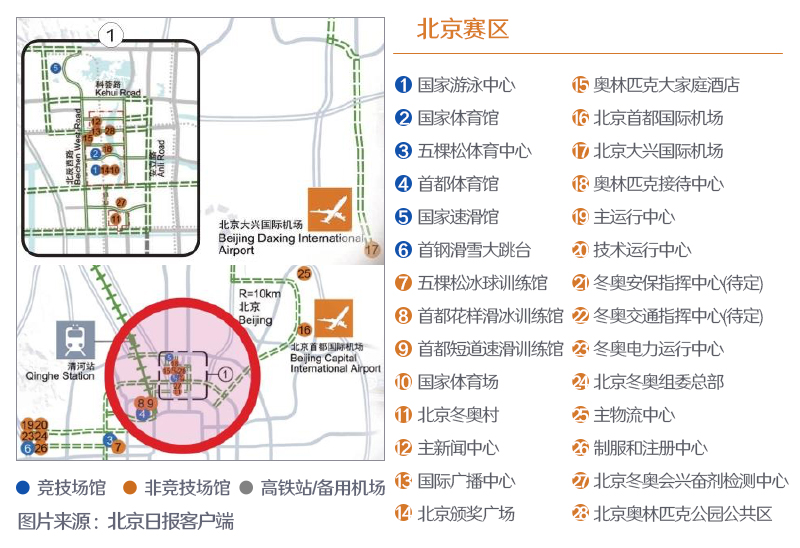 北京冬奧會設(shè)有北京、延慶和張家口三個賽區(qū),共計劃使用25個場館,其中直接用于賽事的競賽場館12個。