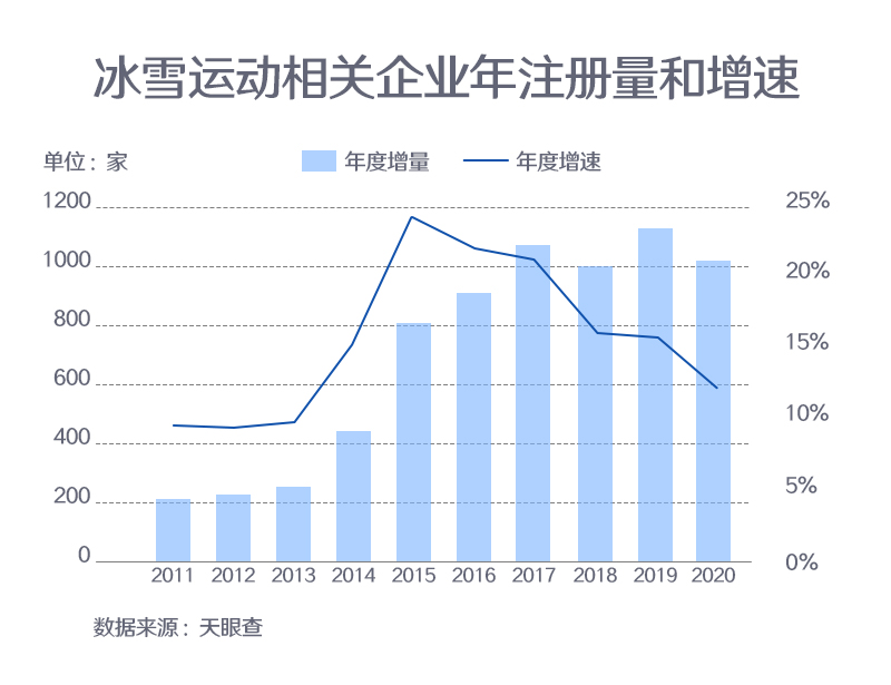 ??? 資料顯示,2015年7月31日,北京獲得2022年冬奧會舉辦權(quán)。同年,天眼查專業(yè)版數(shù)據(jù)顯示,冰雪運(yùn)動相關(guān)企業(yè)年度注冊增速達(dá)到了歷史峰值(全部企業(yè)狀態(tài)),為24.4%。此后的幾年,冰雪運(yùn)動相關(guān)企業(yè)總量仍呈上漲態(tài)勢。以工商登記為準(zhǔn),2020年我國共新增超過1,000家冰雪運(yùn)動相關(guān)企業(yè)。