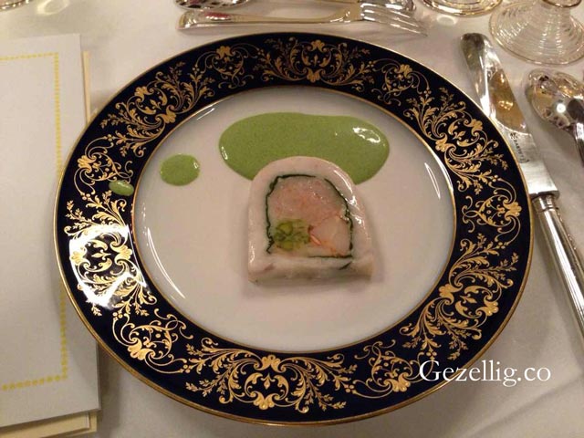 1、Terrine of fish and prawns watercress sauce – 魚(yú)蝦凍配綠豆瓣醬(前菜)