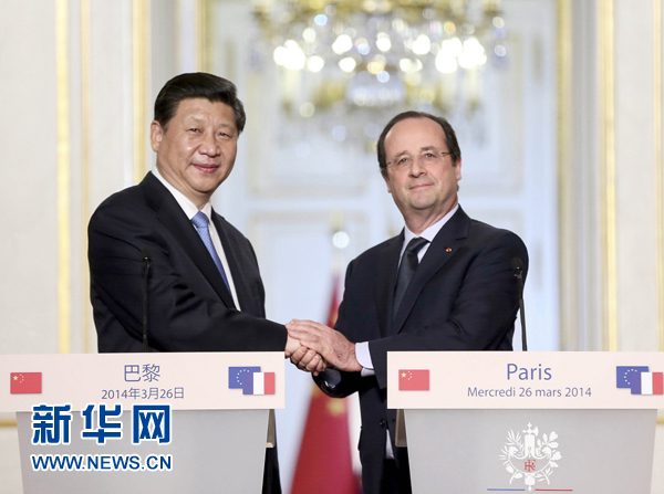 ??? 3月26日,國(guó)家主席習(xí)近平在巴黎與法國(guó)總統(tǒng)奧朗德共同會(huì)見(jiàn)記者。 新華社記者 蘭紅光 攝