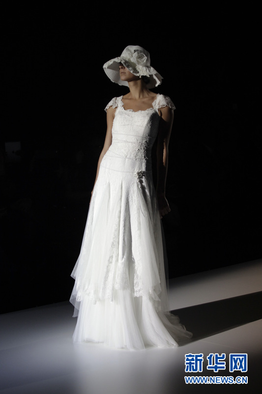 模特在T臺上展示西班牙女服裝設計師 Inmaculada Garcia的婚紗作品。Inmaculada Garcia同時也是來自巴塞羅那當地的一個婚紗品牌。