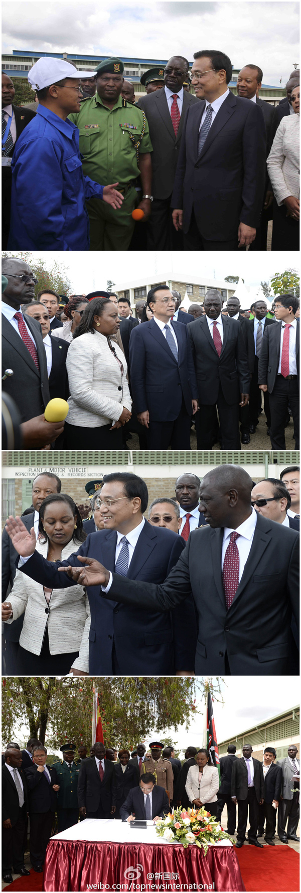 ????新華網北京5月11日電 據新華社“新國際”微博報道,李克強總理11日在肯副總統魯托陪同下參觀國家青年服務隊。這是該國青年培訓機構,2007年以來中方向其提供技術培訓和設備,隊員全部實現就業。李克強贊許說,這創造了雙方合作的新模式,可在非洲推廣。他還欣然留言:青年就業是國家的希望。?